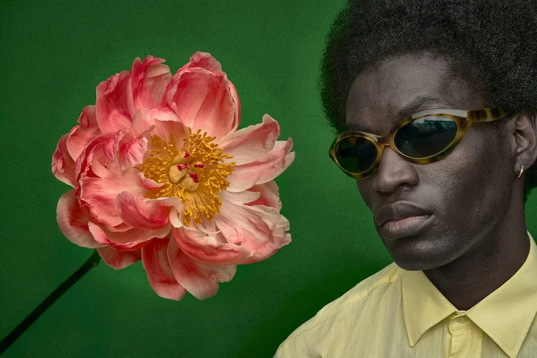 A person with dark skin tone, wearing a pale yellow shirt, chic sunglasses, and a natural afro hairstyle, is facing a large pink peony flower against a green background.