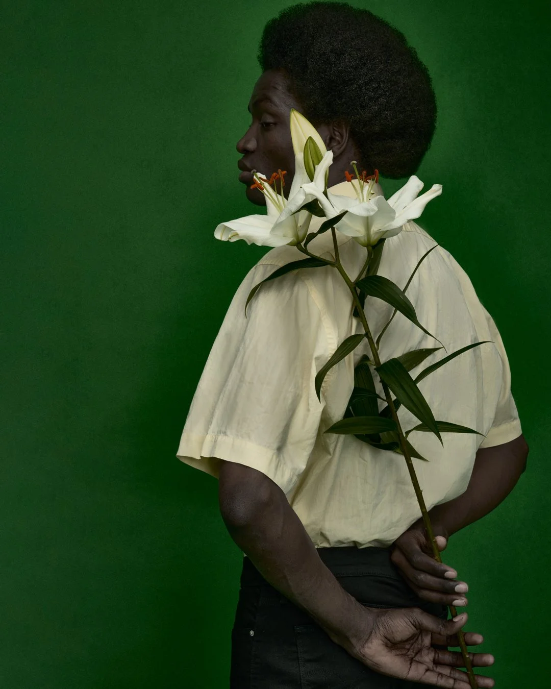 A person with dark skin and curly hair, wearing a pale yellow shirt, is holding a large white lily flower with green leaves against a green background, with the flower positioned near their face.