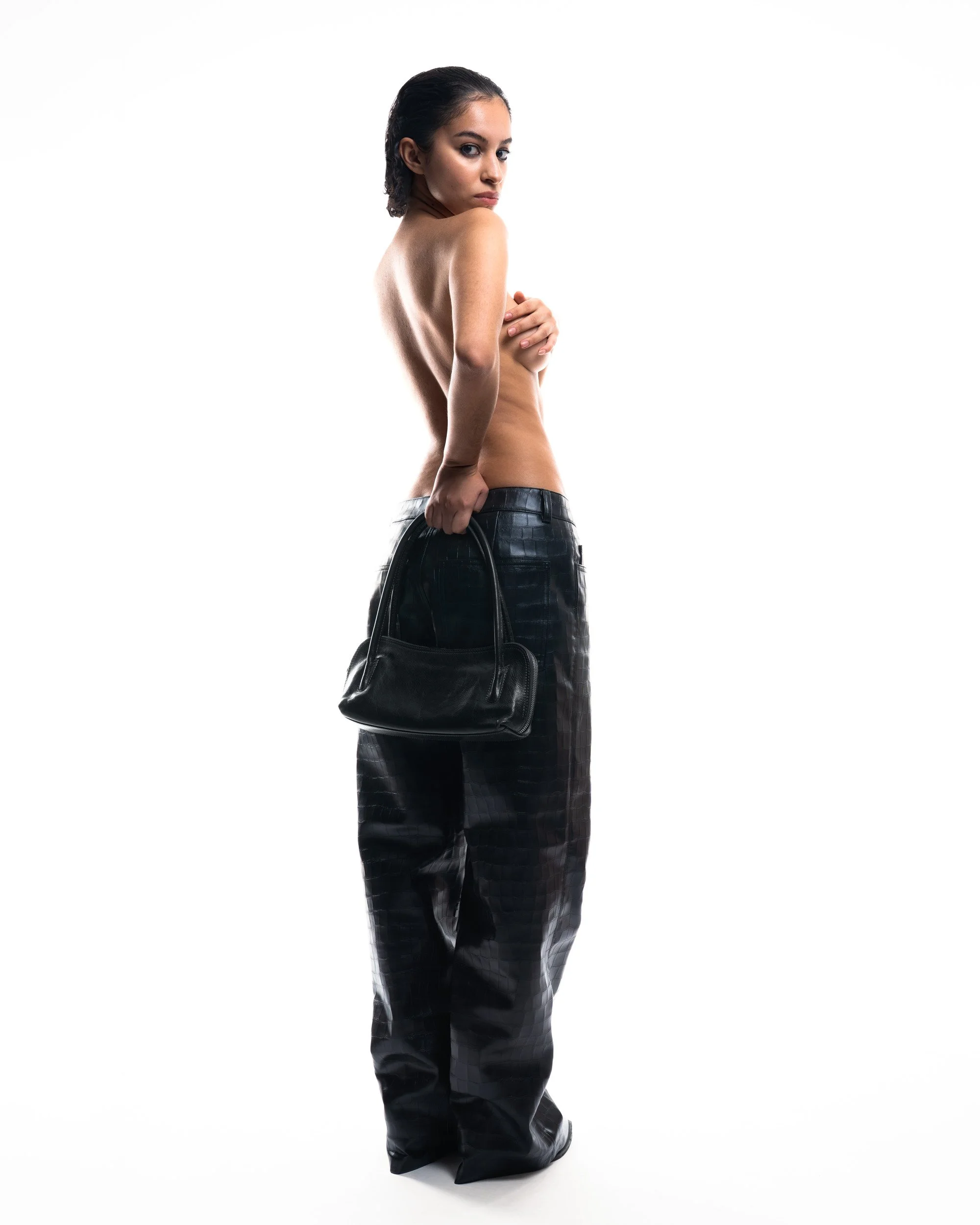 A young woman with dark hair pulled back, holding a black purse, topless, wearing loose black pants, standing against a white background, looking over her shoulder.