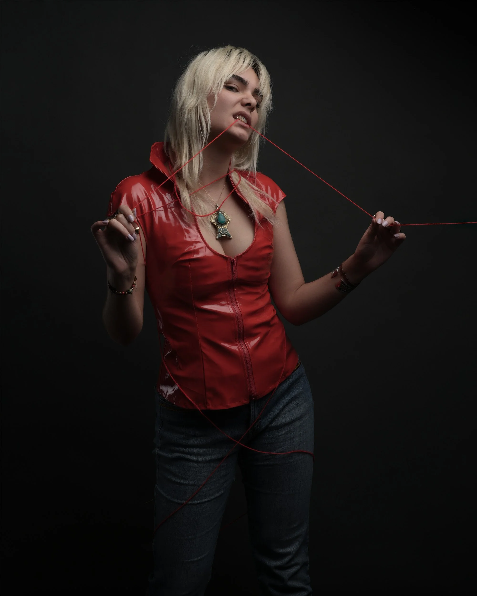 A young woman with platinum blonde hair, wearing a red sleeveless zip-up top and jeans, stands against a dark background, holding red thread that forms a pattern around her face and body.