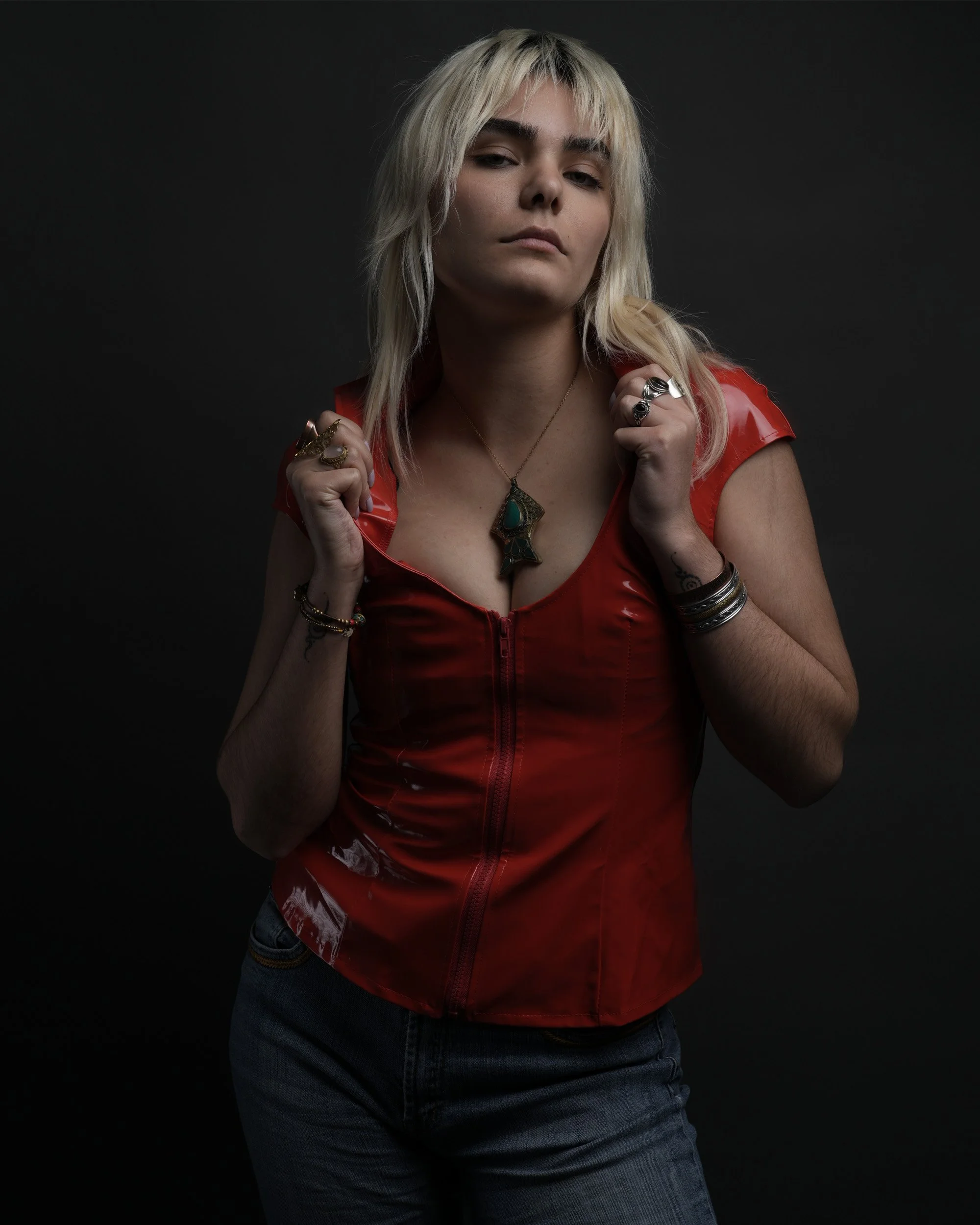 A young woman with blonde hair wearing a red shiny sleeveless top, dark jeans, and multiple jewelry pieces, standing against a dark background.