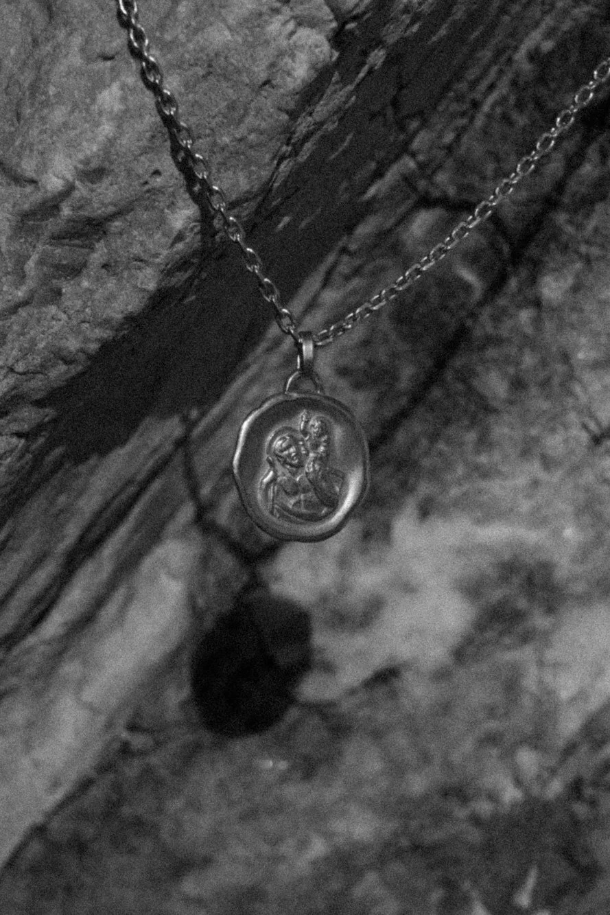 A close-up black-and-white photo of a necklace with a pendant depicting a religious figure, hanging against a rough brick and stone wall.