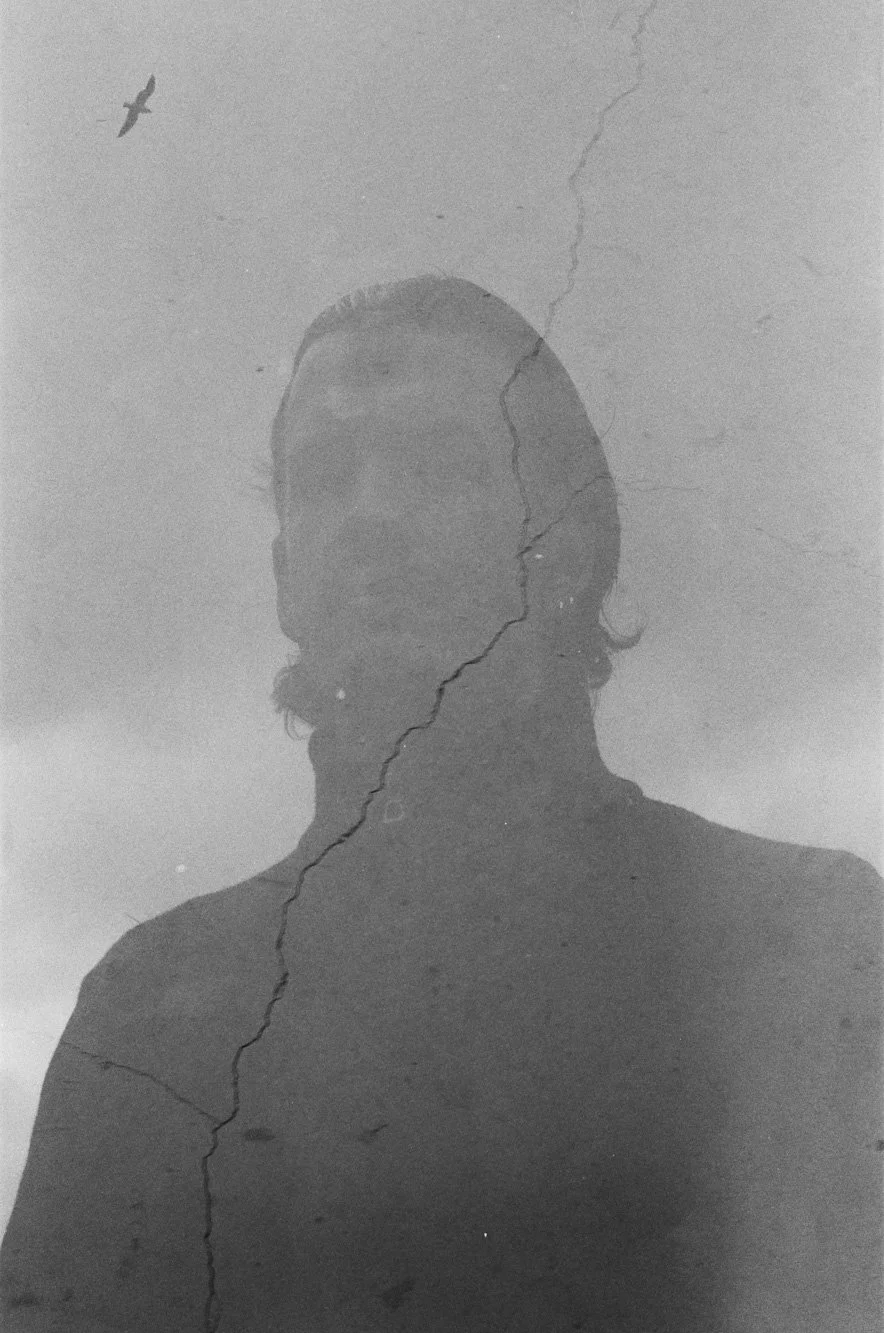 Black and white photo of a person's silhouette with short hair, with cracks visible in the image, and a bird flying in the sky.
