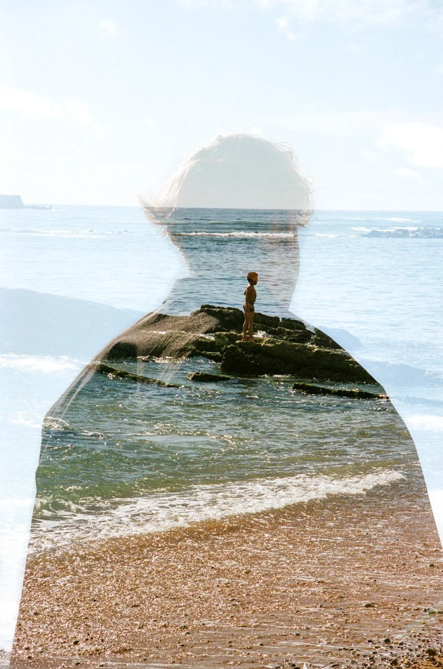Double exposure photo of a person's silhouette and a beach scene with a child standing on rocks by the ocean.