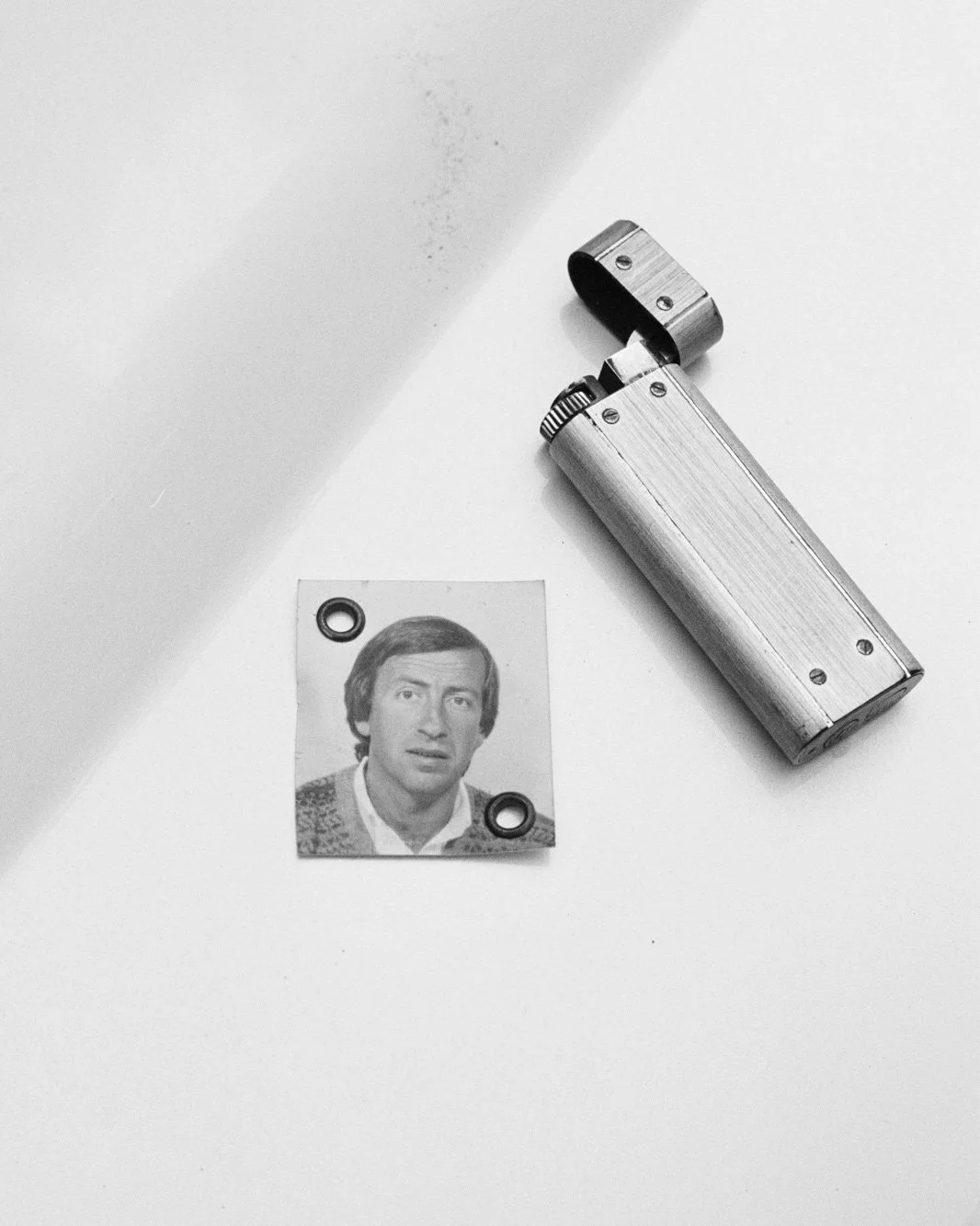A black and white photo of a vintage silver lighters, a photo of a man with dark hair and a patterned sweater, and two metal grommets, all placed on a white surface.