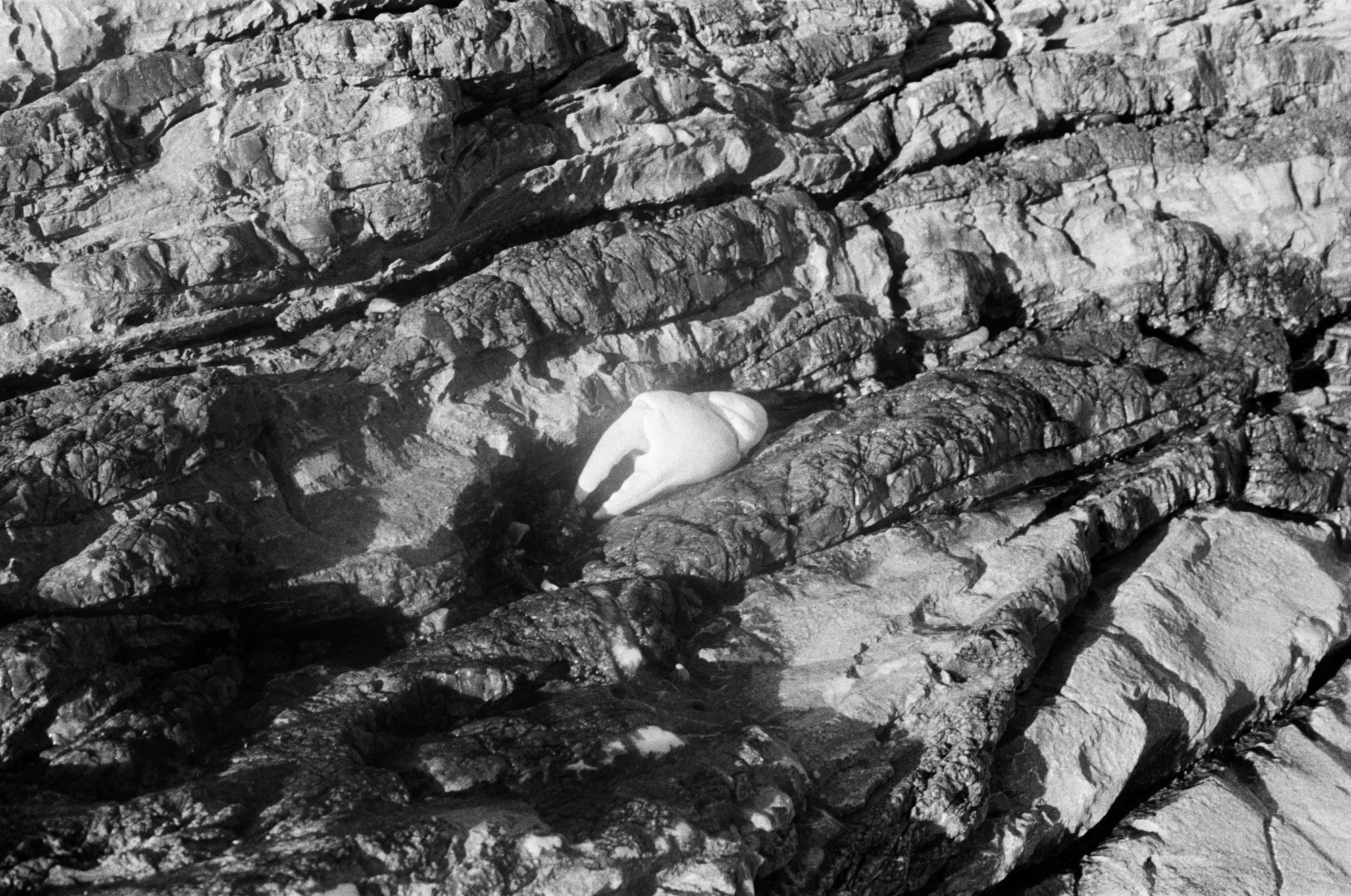 A rock formation with a white bird, likely an albatross, resting on the uneven rocks.
