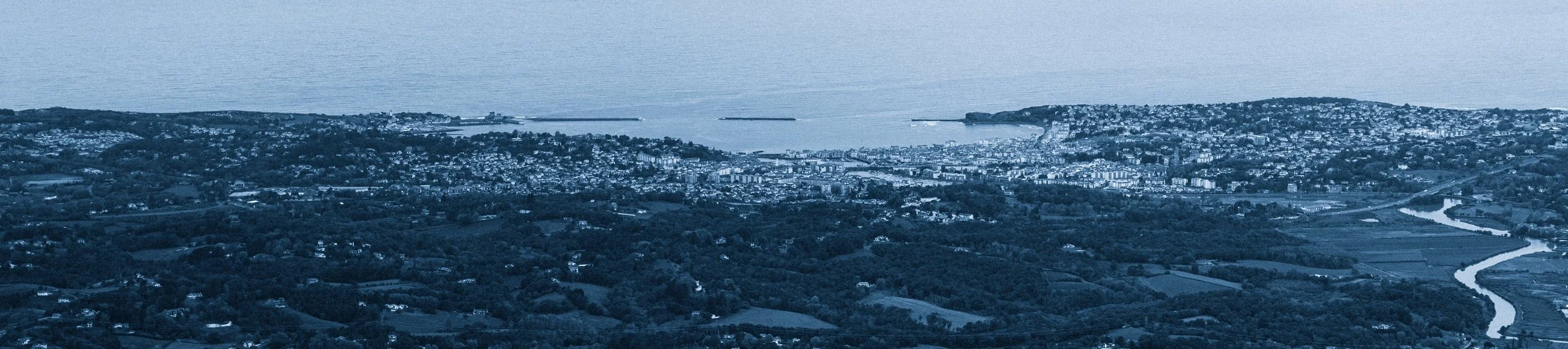 Aerial view of a coastal city with a bay and a winding river, surrounded by hilly terrain covered with greenery.