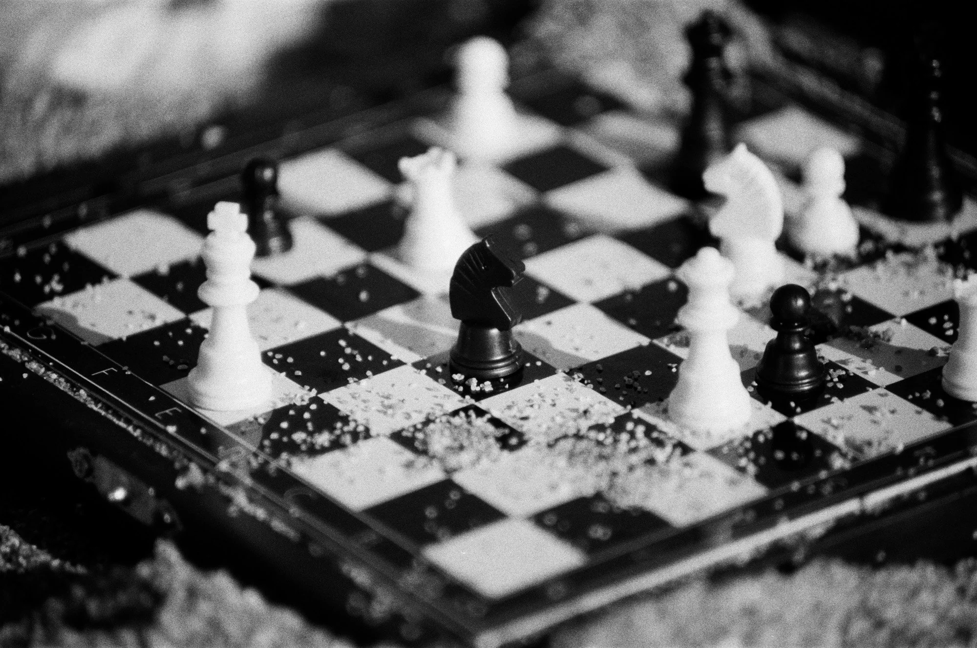 Black and white photo of a chessboard with several white and black chess pieces, some in mid-game, and scattered white pieces on the board.