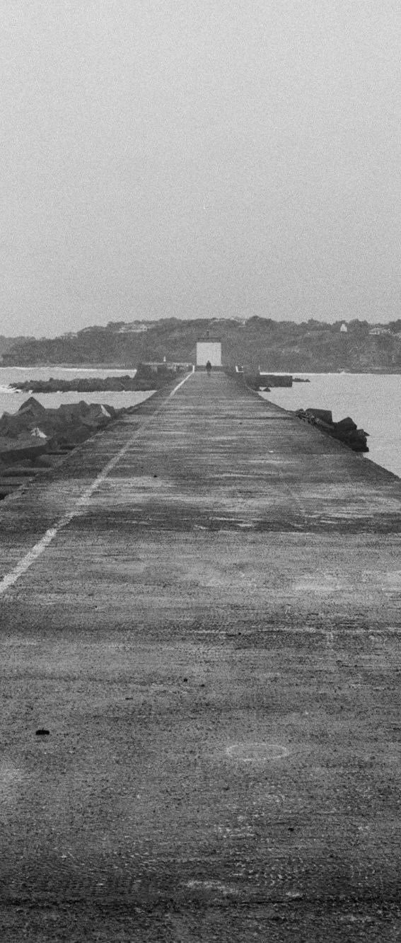 A black and white photo of a long, empty pier extending into the water, with a small building or structure visible at the end of the pier, surrounded by rocky shoreline and distant land.