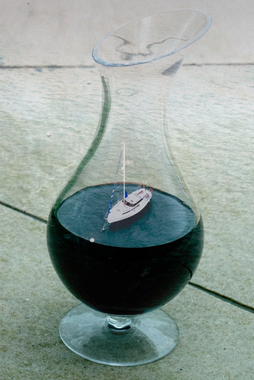 A glass of red wine with a reflection of a sailboat on the surface of the wine.
